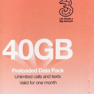 3UK — 英國及歐洲30日/40GB 無限分鐘流動數據儲值卡