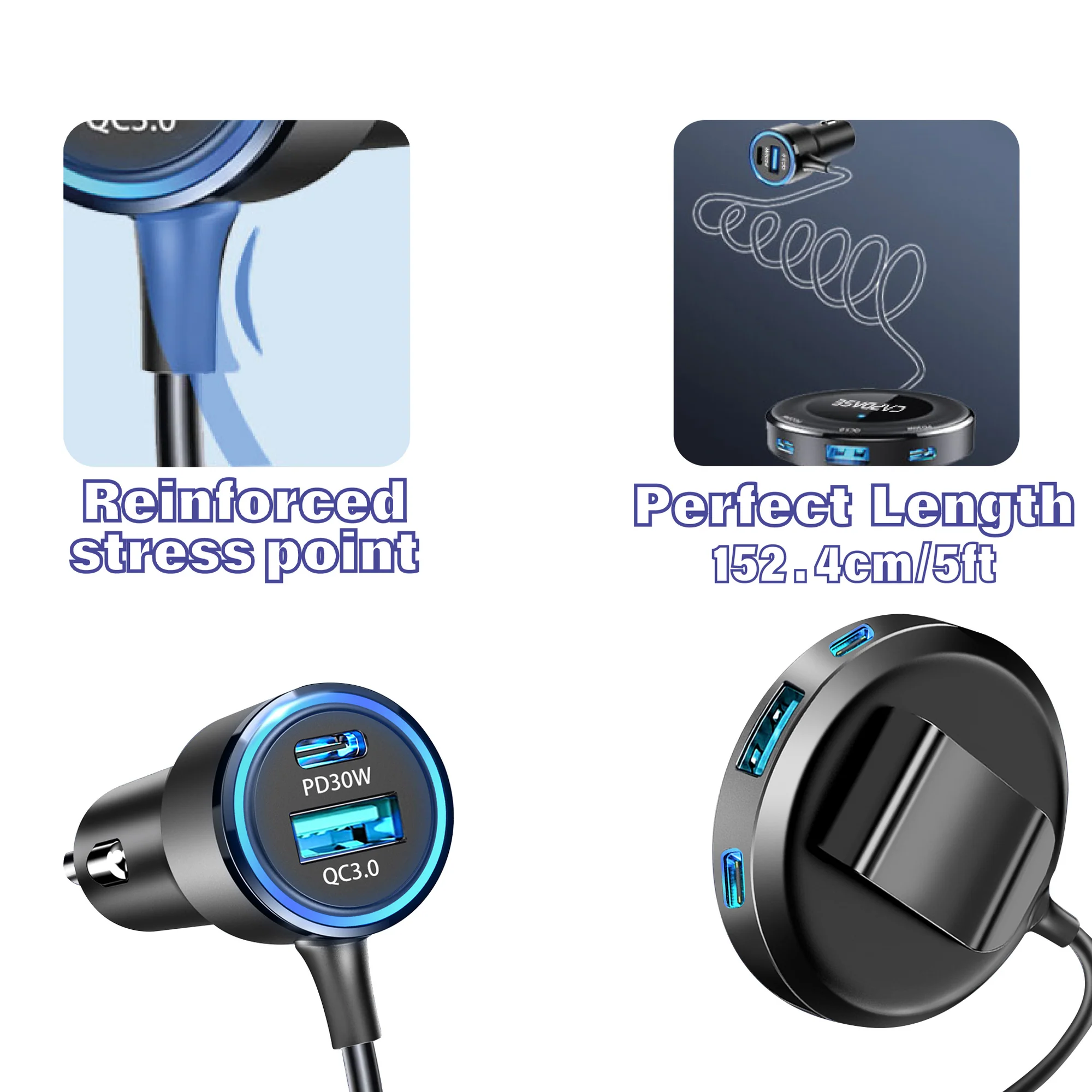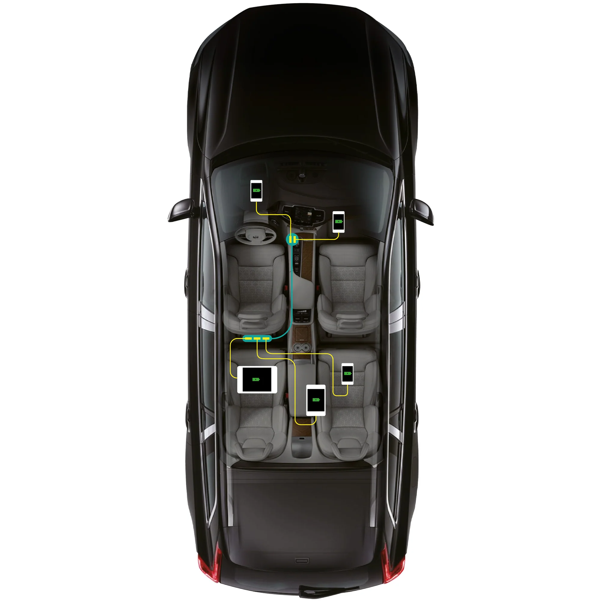 • 延伸充電集線器: 3 個 USB 埠的移動設計,配有耐用夾子,可輕鬆延伸至後座任何位置,為多位乘客充電。