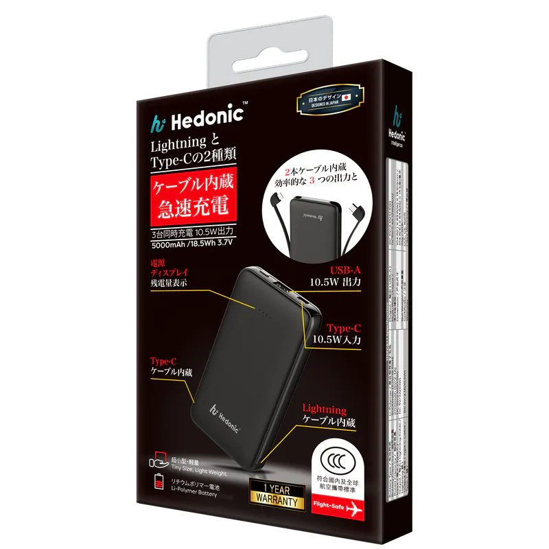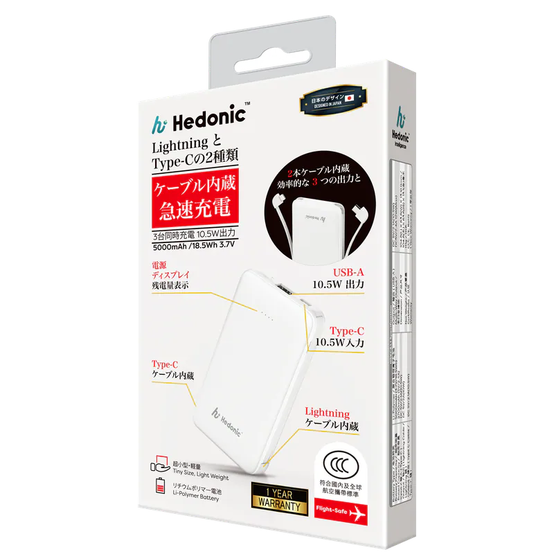 Hedonic — 5000mAh 連Lightning & USB-C (3C認證) (經典款連內置線)
