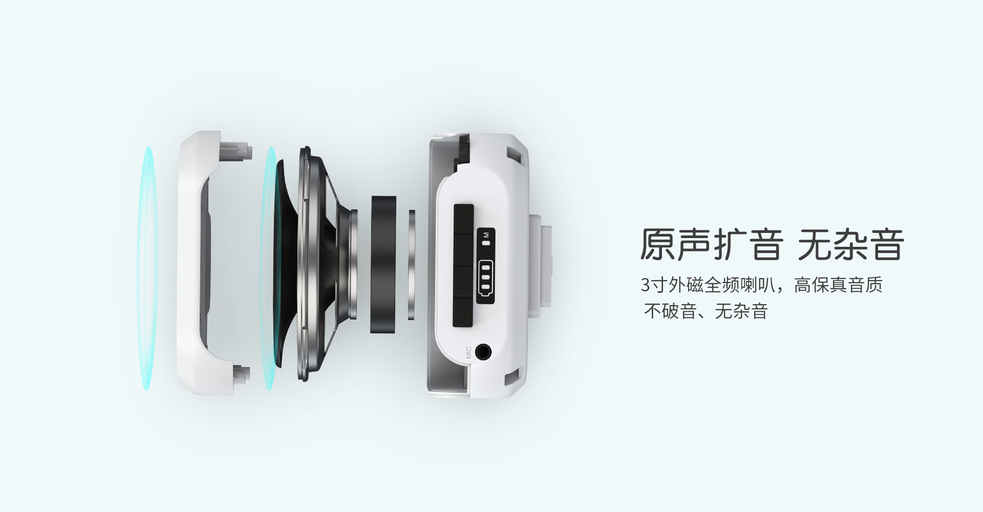 - 聲音清晰: 採用 3 吋外磁全頻喇叭,聲音響亮且穿透力強,無雜音。